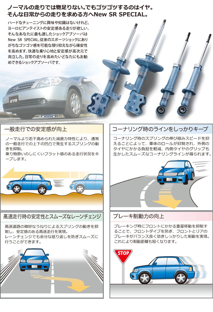 ■商品説明・純正と同等の形状を採用、耐久性など品質はそのままに減衰力特性を最適化することでクルマの「走る」「曲がる」「止まる」といった基本性能をしっかりグレードアップさせながら「乗り心地」とのバランスをコンセプトに開発・「硬くないけどシッカリ!」普段使いの軽快なカジュアルシューズを履いた感覚で安心して走れる、なんか運転がうまくなった?と思わせる仕上げ・NEW SR SPECIALはノーマル状態を基...